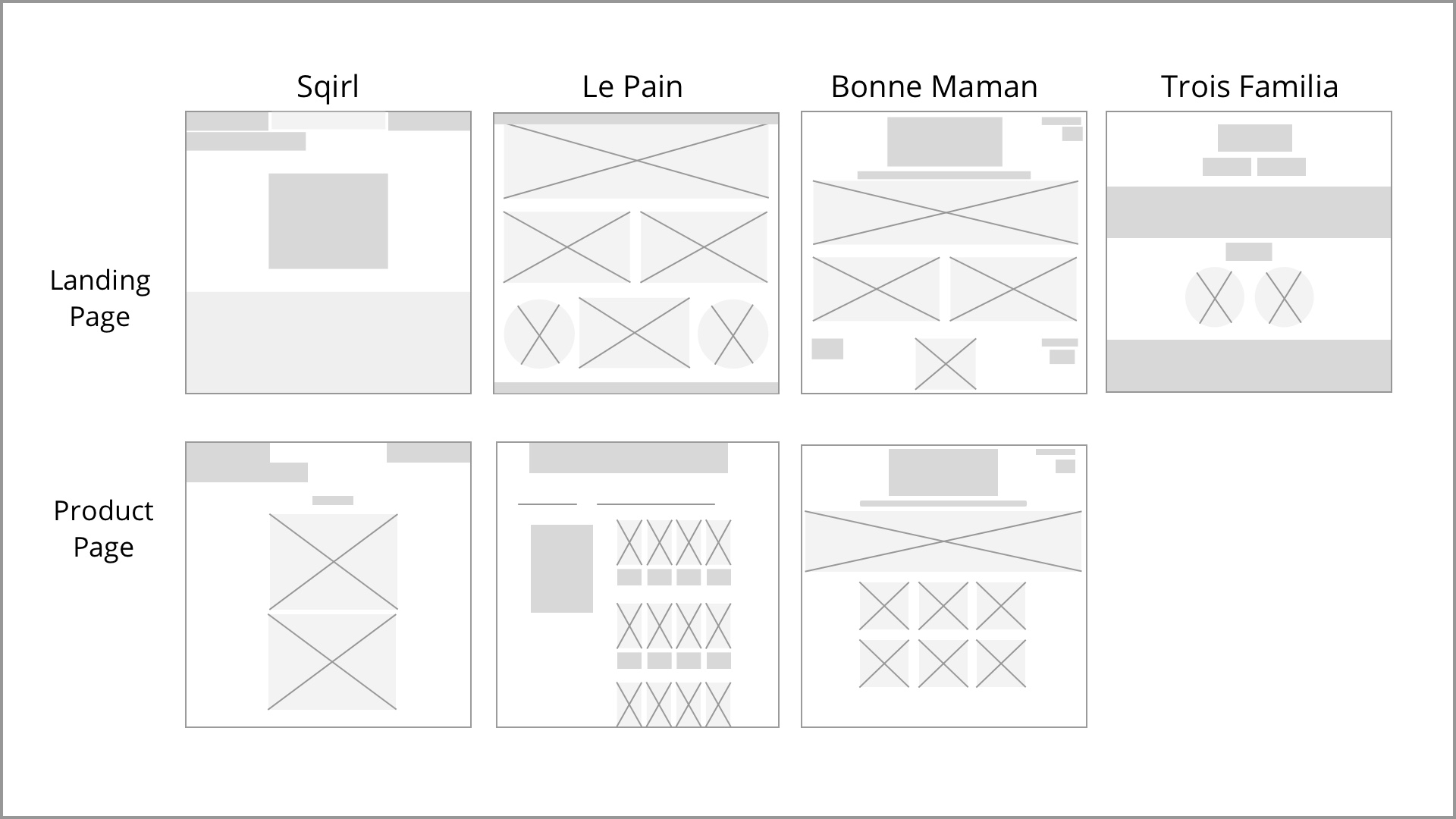 I did a comparative analysis on Sqirl’s competitors, focusing on features and layout. I looked for competitors that were both restaurants and jam sellers. Le Pain is the most direct competitor for jam, as it sells a signature jam and it is a known restaurant. Trois Familia is a restaurant in the same area as Sqirl, they have a similar target audience. Bonne Maman strictly sells jam, B2B and B2C.